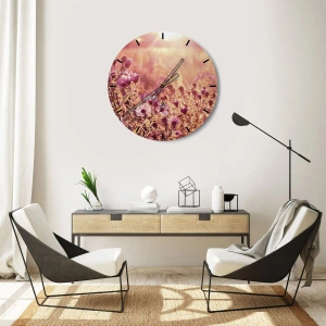 - Ronde klok op glas van 30x30 cm met een afbeelding van paarse bloemen in een veld bij zonsondergang, in een warme, romantische sfeer van de natuur.