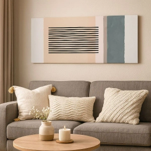 Het canvas wordt over het frame gespannen. De zijkanten en randen zijn bedrukt en zetten het beeld voort. De schilderij is klaar om aan de muur te hangen. Elk product heeft een hanger aan het frame en een montagekit (schroef + pin).