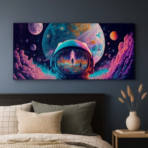 "Philosophers Never Dreamed Of" is een canvas schilderij van 70x50 cm dat een astronaut afbeeldt, omringd door een kosmisch landschap. De achtergrond toont kleurrijke planeten, de sterrenhemel en buitengewone artistieke details die een dynamische en inspirerende compositie creëren. Dit is een unieke wanddecoratie voor liefhebbers van ruimtevaart en hedendaagse kunst.