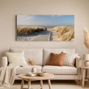- Het schilderij toont een houten pad door zandduinen dat naar een kalme zee leidt. De harmonieuze omgeving straalt ontspanning uit, perfect voor interieurdecoratie.