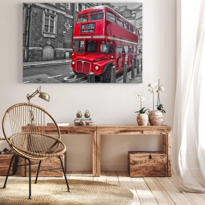 - Dit schilderij toont een rode dubbeldekkerbus in Londen tegen een achtergrond van klassieke architectuur. Het is de perfecte decoratie voor liefhebbers van Britse stijl en stadsgezichten.