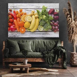 Dankzij de afmetingen 70x50 cm en de canvasprinttechnologie wordt elk detail van deze compositie natuurgetrouw weergegeven. De sappige kleuren van citrusvruchten, groene groenten en warme fruittonen trekken de aandacht en verlevendigen de ruimte. Het schilderij zal perfect werken als decoratief element in de keuken, eetkamer of andere ruimtes die verband houden met culinaire kunsten.