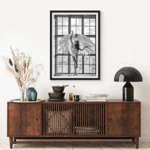 De poster in zwart-wit toont een vrouw met engelenvleugels voor een groot raam. Het elegante en subtiele ontwerp maakt het een perfecte decoratie voor een woonkamer, slaapkamer of artistieke ruimte.