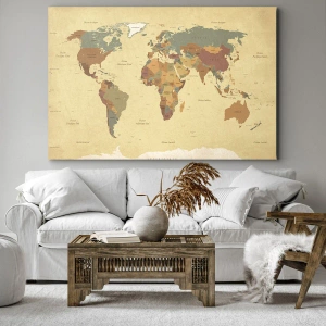 - Een gestileerde canvasprint van een wereldkaart in beige- en pasteltinten. Perfect voor elegante interieurs, een combinatie van esthetiek en functionaliteit.