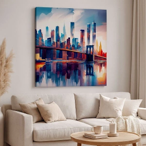 - Een canvasprint van de skyline van New York, met een brug en weerspiegeling in het water. Een perfecte aanvulling op moderne interieurs, die de stedelijke stijl benadrukt.
