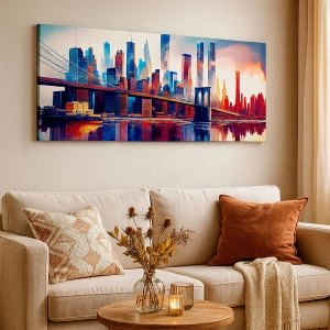 "Dreamlike New York" is een canvasprint van 70x50 cm die het buitengewone panorama van de stad vastlegt. Het unieke uitzicht toont de brug en de weerspiegeling van wolkenkrabbers in het water, wat zorgt voor een harmonieuze en dynamische compositie. Expressieve kleuren en details benadrukken de moderne stijl en voegen karakter en elegantie toe aan interieurs.