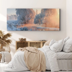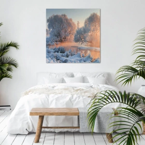 De zonnestralen die door de takken van de bomen dringen, geven het landschap een delicate en stralende uitstraling. Dit tafereel straalt winterse rust en harmonie uit, perfect passend bij de minimalistische stijl van interieurdecoratie. De compositie is ongelooflijk pittoresk en het minutieuze vakmanschap laat u de schoonheid van de natuur ervaren.