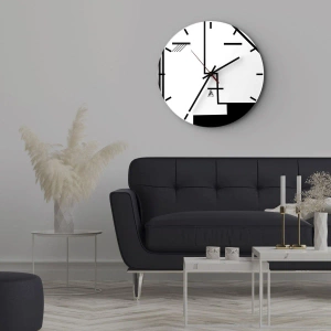 De klok is gemaakt van 4 mm dik gehard veiligheidsglas. De technologie van het maken van de klok voldoet aan de veiligheidsklasse 2B2 volgens de PN-EN 12600: 2004-norm, die weerstand tegen schokken garandeert. De klok op het glas is klaar om op te hangen - hij heeft een metalen hanger aan de achterkant van de klok en een schuimafstand die de even afstand tussen de klok en de muur regelt. De klok heeft een stil zwevend mechanisme dat wordt aangedreven door een batterij van 1,5 V - AA-batterij (batterij niet inbegrepen).