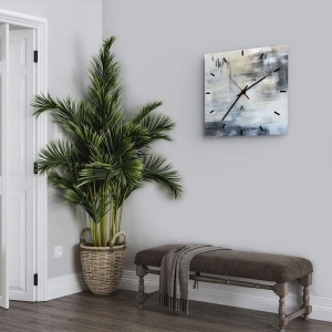 De wandklok "Achter de sluier van blauw" valt op door zijn elegante en ingetogen ontwerp, geïnspireerd op hedendaagse abstracte kunst. De compositie, gebaseerd op een combinatie van grijs-, beige- en wittinten, creëert een harmonieus beeld dat perfect past in minimalistische ruimtes. Het verweerde effect en de gevarieerde oppervlaktetextuur geven de klok diepte en visuele interesse.