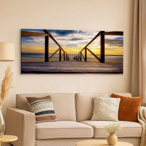 De compositie van dit schilderij symboliseert rust, reizen en ontsnappen aan het dagelijks leven. De houten structuur van de steiger in combinatie met de kleuren van de ondergaande zon geeft het geheel een romantisch karakter, perfect passend bij de nautische stijl en een modern interieur.