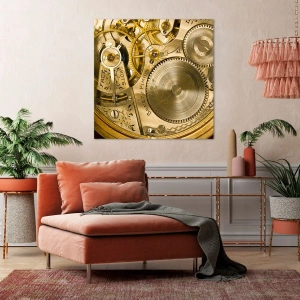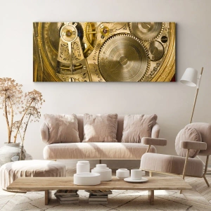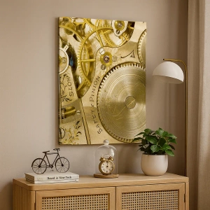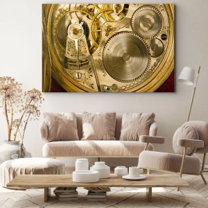 Het schilderij is gemaakt van hoogwaardig canvas, wat duurzaamheid en intensiteit van details en kleuren garandeert. Het horizontale formaat van 70x50 cm past perfect in moderne interieurs, kantoren en industriële ruimtes. Het motief van een horlogemechanisme past perfect bij de minimalistische en technische stijl van de opstelling.