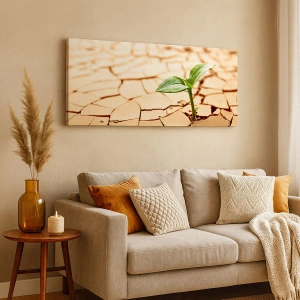 Het motief van een jonge plant die door droge aarde breekt, is een metafoor voor kracht, doorzettingsvermogen en hoop. Dit decoratieve accent is een uitstekende keuze voor wie houdt van kunst geïnspireerd door de natuur en een motiverende boodschap. Het schilderij brengt harmonie en positieve energie in de kamer en stimuleert reflectie en inspiratie.