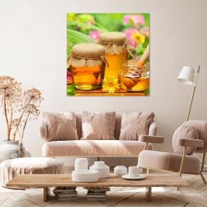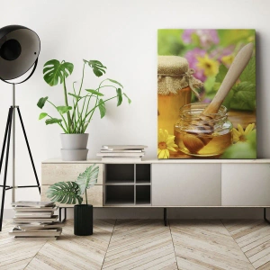 Schilderen op canvas - Potten honing met bloemen tegen de achtergrond van een zomertuin - 70x50cm - Zoet en bloemig - Moderne wanddecoratie voor woonkamer en slaapkamer ARTTOR