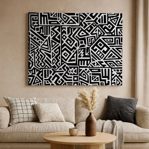 De canvasprint "Precolumbiaanse compositie" is een unieke decoratie die geometrische patronen combineert met inspiratie uit de precolumbiaanse cultuur. Het zwart-witte kleurenpalet, vol contrasten en symmetrie, geeft de compositie een modern karakter en verwijst tegelijkertijd naar een rijke geschiedenis en traditie.