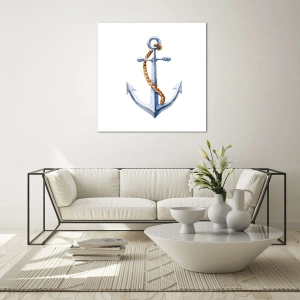 Hoogwaardig vakmanschap en de glasdruktechniek garanderen helderheid en duurzaamheid. Het schilderij wordt gekenmerkt door een minimalistische stijl, gedomineerd door subtiele tinten blauw en natuurlijk beige. Anker, touw en nautische stijl geven het een uniek karakter.