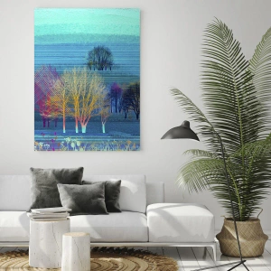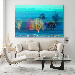 - Het glasschilderij van 70x50 cm toont een abstract landschap met kleurrijke bomen in blauwe tinten, perfect voor moderne interieurs.
