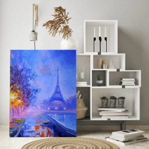 "Droomwandeling" is een sfeervol schilderij dat de charme van het avondlijke Parijs vastlegt. Op de voorgrond zien we kleurrijke bomen, verlicht door straatlantaarns die het pad naar de rivier verlichten. De majestueuze Eiffeltoren domineert de achtergrond, zwevend in een delicate mist, wat romantiek en mysterie toevoegt aan de compositie. Lichtreflecties in het water creëren een uniek effect dat diepte en harmonie geeft aan het hele tafereel.