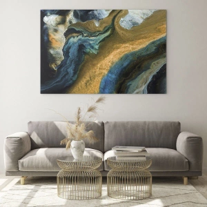 - Een betoverende abstractie met dominante tinten goud en blauw, die structurele kleurovergangen combineert met elegante diepte. Een perfecte decoratie voor moderne en minimalistische interieurs.