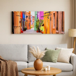 Het canvas schilderij "Kleurrijke straat in mediterrane stijl" is een pittoreske weergave vol warmte en gezelligheid. De straat, omringd door kleurrijke huurkazernes in lichte tinten, straalt rust en de sfeer van een klein stadje uit. Extra details, zoals potten met planten en decoratieve balustrades, geven het schilderij een uniek karakter en brengen harmonie en gezelligheid in het interieur.