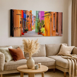 De canvasprint "Kleurrijke Straat in Mediterrane Stijl" is een combinatie van kunst en kwaliteit. Het is een decoratie die elk interieur verrijkt en warmte, harmonie en een vleugje romantiek toevoegt.