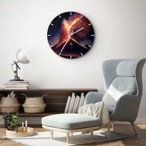De wandklok "Beauty and Terror" verbeeldt het spectaculaire moment van een vulkaanuitbarsting 's nachts. Vanuit de krater stijgt een kolom van vuur, rook en lava op, die de duisternis verlicht met de kleuren rood, paars en oranje. Het is een in de tijd bevroren beeld van de kracht van de natuur en het drama van het moment.