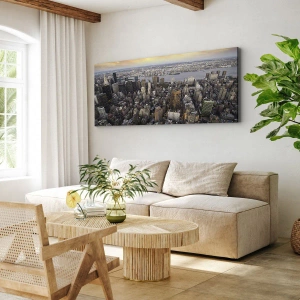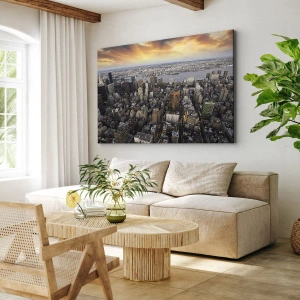 - Het schilderij toont een panoramisch uitzicht op een moderne stad bij zonsondergang. Wolkenkrabbers, ruime straten en het spel van licht benadrukken de charme van de metropool. Het is perfect voor een modern interieur.