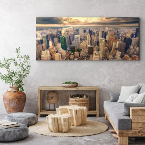 Dit schilderij is een uitstekende keuze voor liefhebbers van stedelijke stijl en hedendaags design. De details van de gebouwen en het contrast tussen de warme kleuren van de lucht en de koele geometrie van de wolkenkrabbers geven het werk diepte en expressiviteit. Het is een ideaal decoratief accent voor een woonkamer, kantoor of commerciële ruimte.
