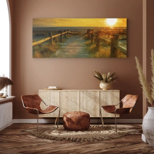 Schilderen op canvas - Een houten pad dat naar het strand leidt in de gloed van de ondergaande zon - 70x50cm - Badend in oud goud - Moderne wanddecoratie voor woonkamer en slaapkamer ARTTOR