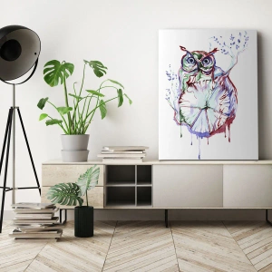 - Het schilderij toont een kleurrijke aquareluil in een artistieke stijl, perfect voor interieurs waar creativiteit en moderne kunst belangrijk zijn.