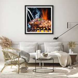 - Deze poster toont een gegrilde biefstuk met aromatische kruiden, omringd door vuur en rook. Perfect voor een keuken of restaurant, inclusief een zwarte lijst van 50x70 cm.
