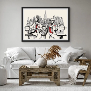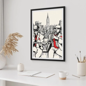 Poster in een zwarte lijst - Twee jazzmuzikanten tegen de achtergrond van de skyline van de stad - 50x70cm - Improvisatie van New York - Moderne wanddecoratie voor woonkamer en slaapkamer ARTTOR
