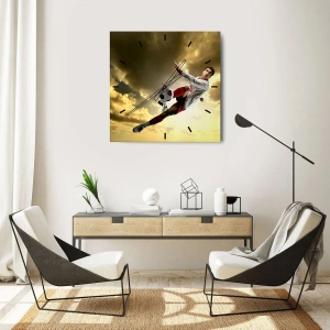 Wandklok - Klok - Een voetballer in dynamische actie tegen een gouden lucht - 30x30cm - Voetbal hemel - Moderne wanddecoratie voor woonkamer, keuken en slaapkamer ARTTOR