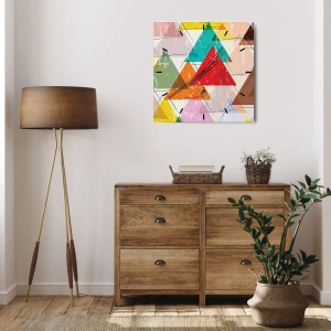 De wandklok "Geometric Vintage" combineert eigentijdse esthetiek met een vleugje retro. De wijzerplaat bestaat uit een compositie van kleurrijke driehoeken in een geometrische stijl, versterkt door een subtiel verouderd effect. Dit motief voegt een uniek karakter en harmonie toe aan interieurs.