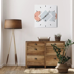 De klok is gemaakt van 4 mm dik gehard veiligheidsglas. De technologie van het maken van de klok voldoet aan de veiligheidsklasse 2B2 volgens de PN-EN 12600: 2004-norm, die weerstand tegen schokken garandeert. De klok op het glas is klaar om op te hangen - hij heeft een metalen hanger aan de achterkant van de klok en een schuimafstand die de even afstand tussen de klok en de muur regelt. De klok heeft een stil zwevend mechanisme dat wordt aangedreven door een batterij van 1,5 V - AA-batterij (batterij niet inbegrepen).