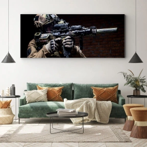 - Het schilderij toont een soldaat in volledige uitrusting, geweer in de hand, klaar voor actie. Perfect voor fans van militaire items en dynamische interieurdecoraties.
