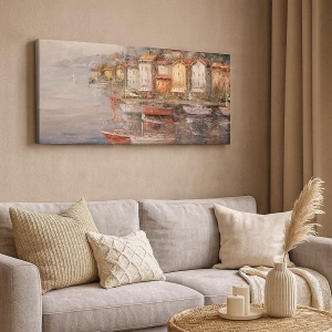 Het canvas wordt over het frame gespannen. De zijkanten en randen zijn bedrukt en zetten het beeld voort. De schilderij is klaar om aan de muur te hangen. Elk product heeft een hanger aan het frame en een montagekit (schroef + pin).