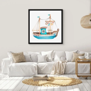 Poster in een zwarte lijst - Aquarelschip in pasteltinten blauw en beige - 50x70cm - Ahoi, avontuur! - Moderne wanddecoratie voor woonkamer en slaapkamer ARTTOR