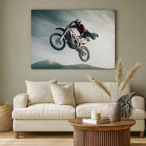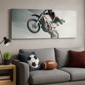 - Het schilderij toont een motorrijder in de lucht tijdens een dynamische sprong, die de energie en adrenaline van extreme sporten vastlegt. Het is de perfecte decoratie voor liefhebbers van actie en passie.