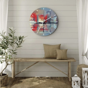 De klok is gemaakt van 4 mm dik gehard veiligheidsglas. De technologie van het maken van de klok voldoet aan de veiligheidsklasse 2B2 volgens de PN-EN 12600: 2004-norm, die weerstand tegen schokken garandeert. De klok op het glas is klaar om op te hangen - hij heeft een metalen hanger aan de achterkant van de klok en een schuimafstand die de even afstand tussen de klok en de muur regelt. De klok heeft een stil zwevend mechanisme dat wordt aangedreven door een batterij van 1,5 V - AA-batterij (batterij niet inbegrepen).