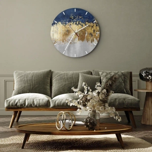 - De klok heeft een abstracte compositie in tinten goud, zilver en diepblauw. De diffuse reflecties creëren een gevoel van luxe en diepte en voegen een elegant, modern decoratief accent toe aan het interieur.