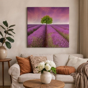- Het schilderij toont een pittoresk lavendelveld met een eenzame boom tegen een paarse lucht. De warme kleuren en het vredige landschap brengen harmonie in door de natuur geïnspireerde interieurs.