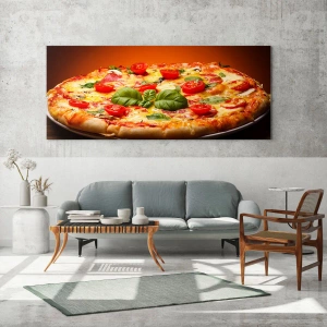 De compositie "Pizza met tomaten, basilicum en gesmolten kaas" brengt vreugde en positieve energie in elke ruimte. Ideaal als decoratief element in horecagelegenheden zoals pizzeria's of restaurants, waar het een sfeer creëert die het genieten van een maaltijd stimuleert.