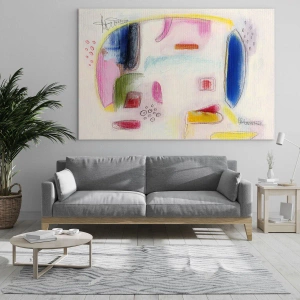 - Dit glasschilderij van 70x50 cm toont moderne abstractie met kleurrijke, geometrische vormen en pasteltinten. Perfect voor interieurs die artistieke expressie en subtiele elegantie vereisen.