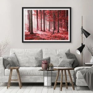 - Deze poster toont een ochtendbos met rode bladeren en mist. Deze foto, met zijn subtiele details, is perfect voor elegante, minimalistische interieurs.