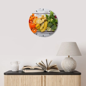 - Deze wandklok heeft een kleurrijk fruit- en groentemotief op een houten achtergrond. Perfect voor keukens, woonkamers of eetkamers. Het ronde formaat van 30x30 cm geeft elke ruimte een frisse touch.