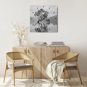 - Een wandklok met een subtiele zwart-witcompositie van een solitaire boom die in het water weerspiegeld wordt. De minimalistische vorm en het vredige landschap brengen harmonie in het interieur.