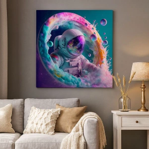 - Dit schilderij toont een astronaut omringd door een kleurrijke kosmische aura tegen een galactische achtergrond. Een perfecte keuze voor moderne interieurs, het brengt magie en inspiratie.