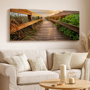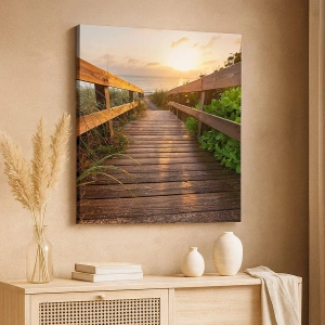 "En rechtdoor naar de kust" is een schilderij dat harmonie en rust in het interieur brengt. Het toont een houten steiger die naar een strand leidt, omringd door groen en gras, gehuld in het warme licht van de ondergaande zon. Deze scène legt de schoonheid van de natuur op zijn meest ontspannend vast.