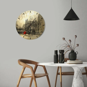 Deze unieke wandklok presenteert een artistieke visie op een Londense straat in een mistige sfeer. Gestileerd als een cartoon voegt hij een vleugje elegantie en nostalgie toe aan interieurs. Het romantische motief van twee figuren in het midden en het karakteristieke rode accent introduceren een opvallend element.