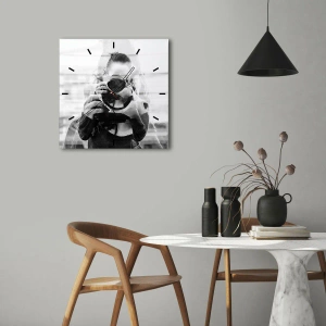 - Een moderne klok met een artistieke afbeelding van een vrouw die een foto neemt, gepresenteerd in een dubbele belichtingsstijl. De compositie is zwart-wit, perfect voor minimalistische interieurs en creatieve ruimtes.